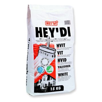 Hey'di Hvit er en sementbasert, vanntett og diffusjonsåpen dekorpuss/slemming til overflatebehandling av mur og betong. Hey'di Hvit blandes med vann og gir en dekorativ, hvit overflate. Inn- og utvendig på betong, puss, Leca, tegl og annet murverk. Fasader - sokkeletasjer - kjellervegger - piper - garasjer - havemurer m.m.