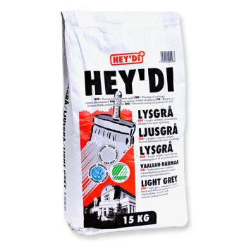 Hey'di Lysgrå er en sementbasert, vanntett og diffusjonsåpen dekorputz/slemming til overflatebehandling av mur og betong. Hey'di Hvit blandes med vann og gir en dekorativ, hvit overflate. Inn- og utvendig på betong, puss, Leca, tegl og annet murverk. Fasader - sokkeletasjer - kjellervegger - piper - garasjer - hagemurer m.m.
