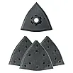 Slipeplatesett med papir. Stor trekantet slipeplate for sliping med støvavsug. Skumgummikledd bæreplate av plast for å unngå skader og merker på arbeidsstykket. Trekantet, hullet utseende, borrelåsplate. Kantlengde 130 mm.