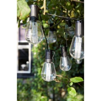 Den ultimate lysslyngen til å henge opp til hagefesten eller som kosebelysning på verandaen. Lysslyngen er utstyrt med 10 solcellelamper med LED-dioder som lyser i varmt, hvitt lys. Lysslenken drives av et solcellepanel på batteri og lampene er laget av svært slitesterk UV-bestandig plast. Med riktig plassering og nok sollys i løpet av dagen kan lysene lyse i ca. 6 timer. Batteri medfølger.