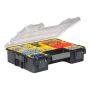 Praktisk oppbevaringskoffert med uttakbare rom, perfekt for små deler og tilbehør som ellers forsvinner i en større skuff. Det uknuselige gjennomsiktige glasset gjør at du raskt kan få oversikt over hva som er i kofferten, uten å måtte åpne den. Lokkets unike design gjør at selv de separate rommene i boksen holdes på plass når lokket lukkes. Sortimentskofferten har kraftige spenner og ergonomisk bærehåndtak for enkel og sikker transport. Brede sidespenner muliggjør for sikker stabling av flere kofferter, der 3 stk kan bygges sammen til en enhet.