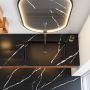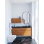 Et elegant veggspeil med moderne design og svart ramme som gir en luksuriøs to...