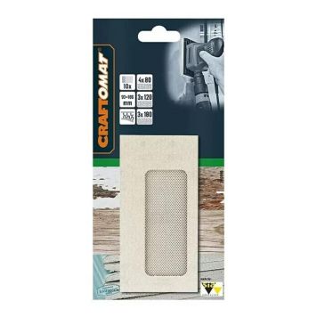 Dette 10-delers sett består av 4 slipepapir med en kornstørrelse på 80K, 3 slipepapir med en kornstørrelse på 120K og 3 slipepapir med en kornstørrelse på 180K.