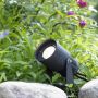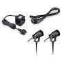 To spotlights med en høyde på 30 cm som enkelt kan trykkes ned i jord eller grus for å få en uplight effekt. Lyset skinner i et varmhvitt lys og gir en mykt inntrykk.