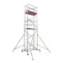 Stillas produsert i aluminium av høy kvalitet. Kan monteres raskt og uten behov av ekstra verktøy, dette på grunn av sin presstilpassing og formtilpassede klemtilkoblinger samt plug-in ramme med systemkomponenter. På grunn av sin lave høyde samt innfellbare stabilisatorer kan basen enkelt flyttes gjennom dører og ganger og er derfor perfekt til innredningsarbeid. Dens v-formede stabilisatorer gir en maksimal sikkerhet. Veldig stabil konstruksjon.