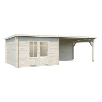 En perfekt kombinasjon av oppbevaring både inne og ute. Det flate taket og rette linjene skaper et moderne uttrykk og blir et stilig innslag i hagen din. Ella har en åpen del som enkelt kan gjøres om til en koselig uteplass. Samtidig har hagestuen Ella flere praktiske fordeler, som oppbevaring både utendørs under tak og innendørs. Hytta er knutetømret med 28mm tykke vegger og kan bygges reversert. Kombiner gjerne med veggpaneler.