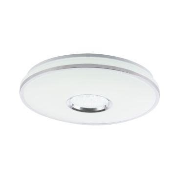 Med denne taklampen Rena kan et bredt utvalg av lysscenarier skapes for å gi et rom den ideelle atmosfæren. Du kan endre og fikse fargetemperaturen fra 3000K til 6000K som du ønsker med den medfølgende fjernkontrollen. I tillegg kan du dimme lyset etter ønske, slik at alle kan bestemme selv hvor sterkt de ønsker at lyset skal være. Lampen på 49 cm er laget av hvitt metall og opal akryl og i midten av lampen er det et Sparkle dekormønster. Takket være den medfølgende 60 watt LED-pæren gir armaturen 4800 lumen sterkt lys. Du kan også kombinere taklampen veldig bra med andre modeller i serien og det er best å integrere den i et soverom.