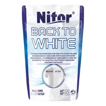 Nitor Back to White er produktet for gjenfarging til originalfargen. En effektiv måte å vaske tilbake fargen på hvite plagg. Følgende stoffer kan farges på nytt med Back to: bomull, lin, viskose, jute stoff og stoffer med minst 50% av disse fibrene.