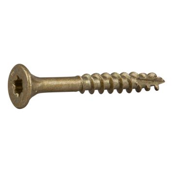 Treskrue beregnet for montering og sammenføyning av trevirke, til utendørs bruk. Skruen er produsert av sterkt og fleksibelt stål, med Corrseal overflatebehandling. Har TX-spor. Treskruen har en patentert spiss som sørger for at skruen griper umiddelbart og hodeformen gir en perfekt finish uten sprekker eller fliser. Fresespor på stammen gir et lavt innskruingsmoment og bidrar til økt klemkraft.