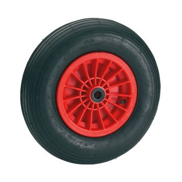 Pneumatisk gummihjul i størrelsen 4,80/4,00 x 8", med rillet profil som har glidelager og felg i robust plast.