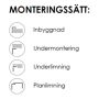 - Kan installeres på alle vanlige måter som innbygging, undermontering, underliming og planliming