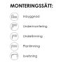 - Kan installeres på alle vanlige måter som innbygging, undermontering, underliming og planliming