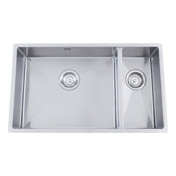 Radius 70 KV X er en dobbelvask med høy mellomvegg i kraftig 1,2 mm rustfritt stål med børstet overflate for 800 mm skap. Kan installeres på alle vanlige måter som innbygging, undermontering, underliming og planliming. Vasken er designet med rene linjer som gir en glansfull finish. Alle Radius-vasker passer både i en tre- eller steinlaminatplate og i en hel rustfri benkeplate.