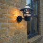 En vegglampe med klassisk design som passer fint på husveggen, terrassen eller balkongen. Lampen som har sin lykt nedover, gir et sterkt og godt lys på grunn av sitt utseende. Nordlux Copenhagen er en serie lamper i svart, børstet stål og galvanisert. Den finnes som vegglampe opp/ned, med bevegelsessensor samt som pullert.