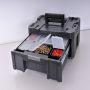 Et innovativt design som er robust og holdbart. Alle enheter kan stables ovenpå den andre og har holdbare sidespenner for å sikre alle enhetene. Verktøykassen har avtagbare kopper for små deler (2 store og 2 små). Håndtak i bi-materiale på toppen av hver anordning som sikrer et enkelt og greit løft.