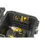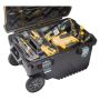 Verktøyvogn med mulighet for å feste tilleggsutstyr til lokket, med stropper. Lokket er også utstyrt med V-spor for saging og kapping. Vognen har innebygget stoppmekanisme som holder utstyret på plass under transport og profesjonelle metallspenner og hengelåshemper for økt sikkerhet. Det robuste håndtaket og de tykke 7" hjulene gjør verktøyvognen enkel å flytte og manøvrere. Kassen er utstyrt med et avtakbar vertikal oppbevaring for håndverktøy, og et bredt avtakbart brett med integrert ekstrahåndtak for enkel løfting.